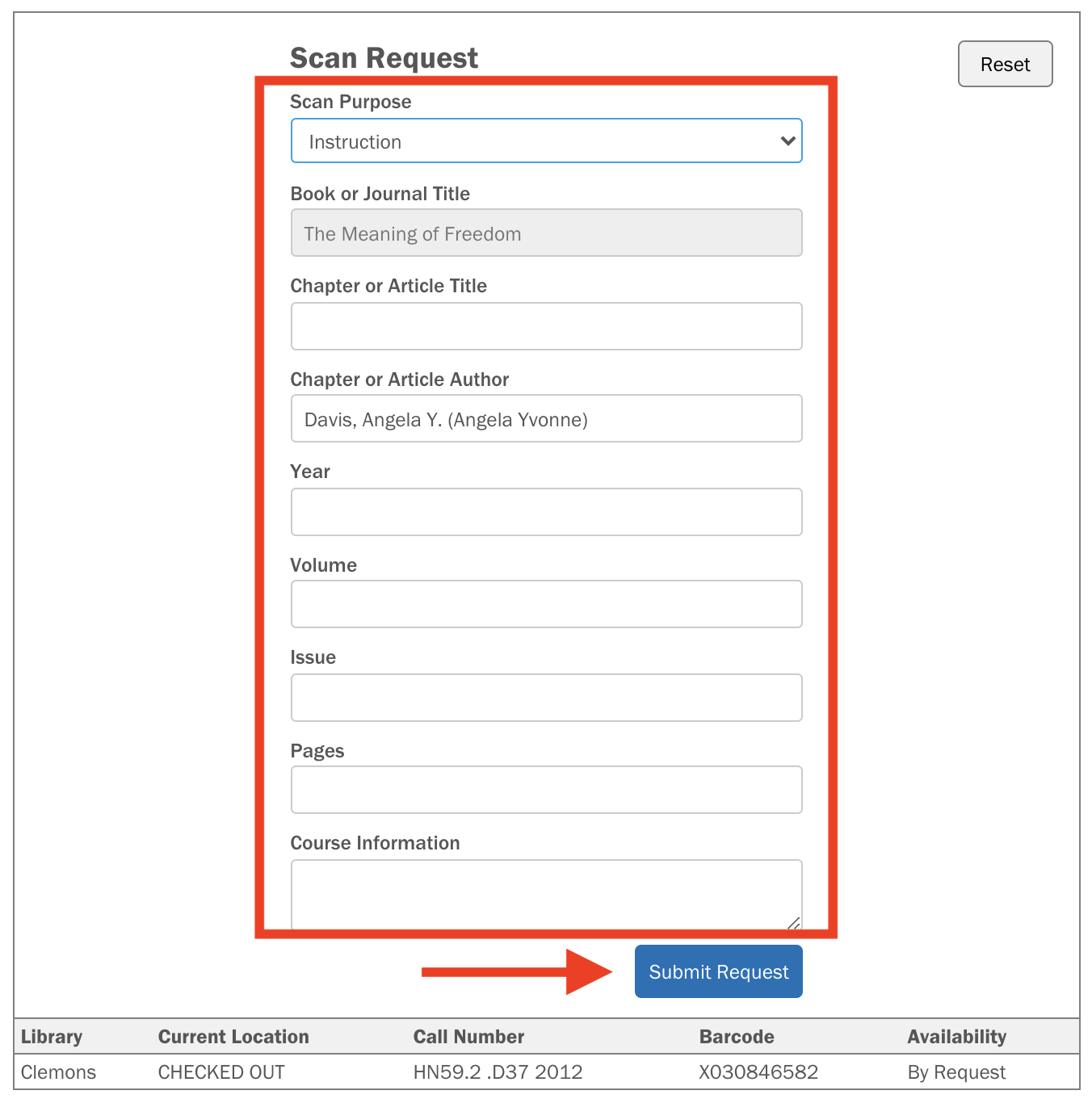 - Select “Instruction” as the Scan Purpose and fill out the form to indicate the chapter or section you’re requesting for reserve. You must also indicate the course information (for example, AMST 3995-001). Then, click “Submit Request.”